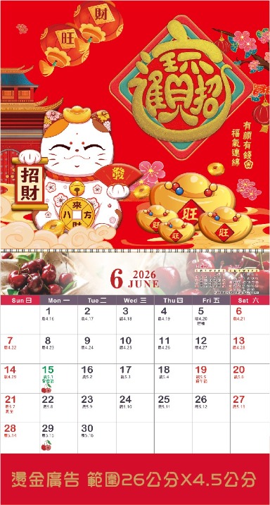 YM6004 招財貓-七彩凸版月曆 廣告尺寸(寬X高):約26X4.5CM 摺合尺寸:約37X34CM 廣告方式: 燙金 裝訂: 雙線圈吊版 張數: 六開 吊版+12張 商品圖顏色因拍照環境、燈光及個人電腦螢幕設定的關係而略以色差貨將以實際商品顏色為準
