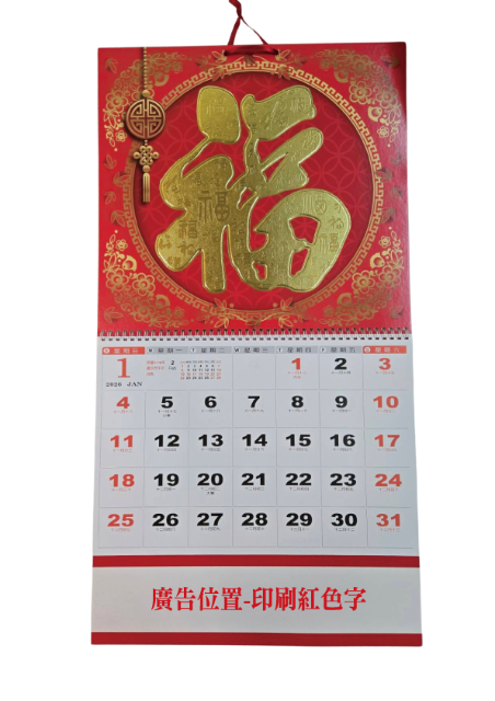 MK601 福 (燙金打凸月曆) 封面-340單銅+450g灰銅紙貼合封底-340g單銅 內頁 -120g特銅紙.單面雙色印刷 規格:37cmX69cm 廣告方式:單色網版印刷 廣告尺寸:30cmX4cm (附塑膠提袋) 商品圖顏色因拍照環境、燈光及個人電腦螢幕設定的關係而略以色差貨將以實際商品顏色為準