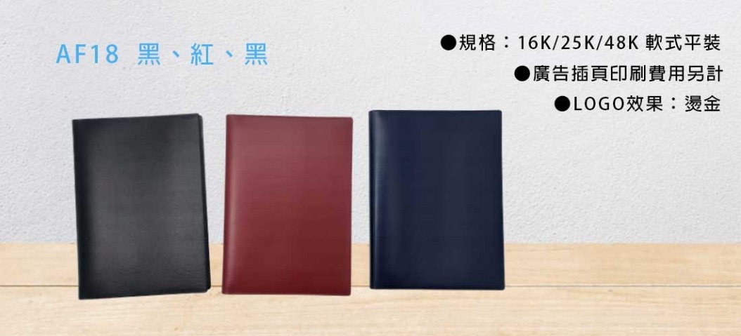 尺寸:16K/25K/48K 顏色:紅、藍、黑 廣告插頁印刷費用另計 燙金尺寸(超出基本燙金範圍,燙金價格須另議): 16K(13.5x3.5 cm)、25K(10.5x2.5 cm)、48K(7x3.5cm)